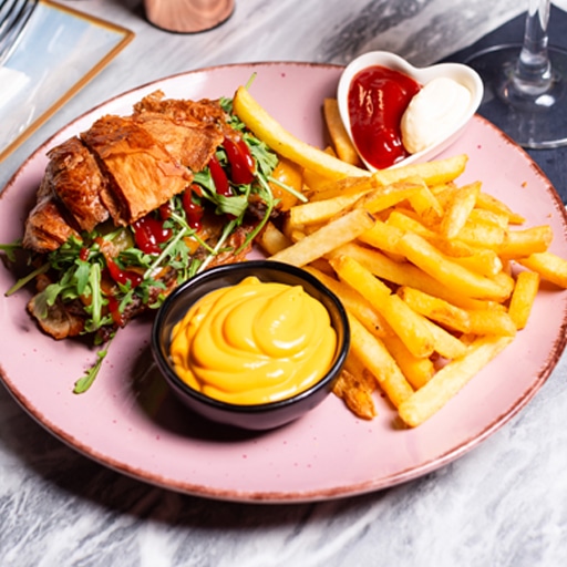 18,90 €Croissant with crispy chicken, cheddar cheese, rocket, gherkins, tomato, red onions, mayo and ketchup